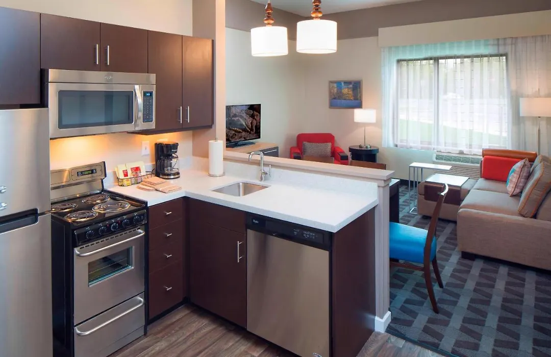 Rooms at Towneplace Suites are air-conditioned and include a full kitchen, flat-screen TV, ergonomic workstation, and luxury bedding. Each unit features a kitchenette with a stovetop and refrigerator, allowing guests to cook their favorite meal.
