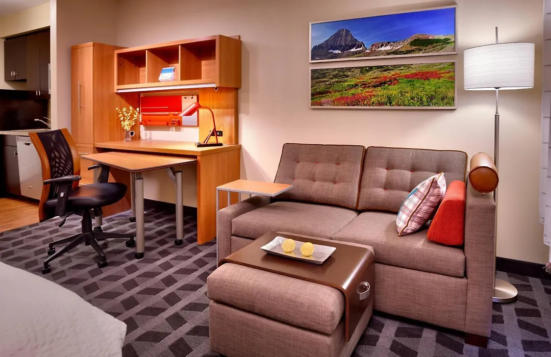 Accommodations at TownePlace Suites include studio and one or two-bedroom suites featuring kitchens, flat-screen TVs, and premium bedding. Each unit has a seating area with a sofa and a dining area, providing ample space for relaxation.