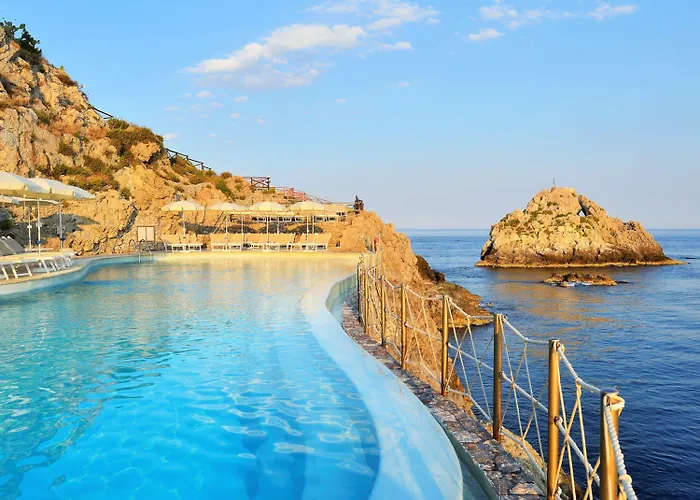 UNA HOTELS Capotaormina, a 4-star hotel rated 8.9/10 on Booking.com, offers a blend of luxury and nature along the Sicilian coastline. Guests can enjoy amenities like a seawater swimming pool, private beach, and wellness center.
