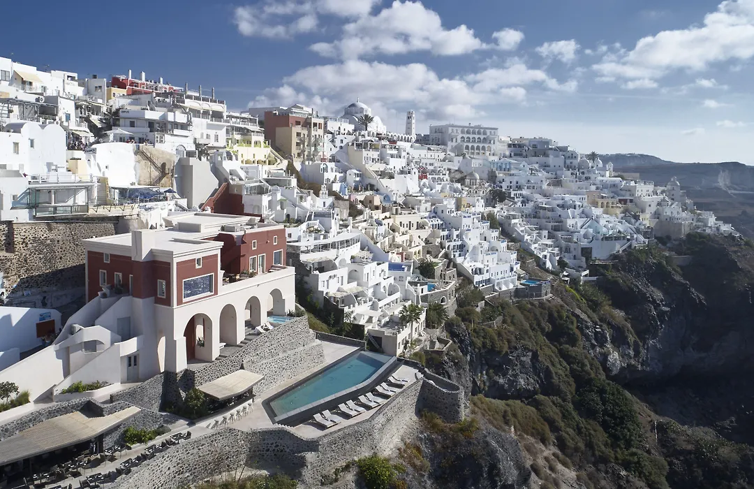 Villa Bordeaux, a 5-star luxury villa in Fira boasts a 9.6/10 rating on Booking.com. The property features upscale amenities, including an infinity pool and gourmet dining options with panoramic views of the caldera and volcanic islets.