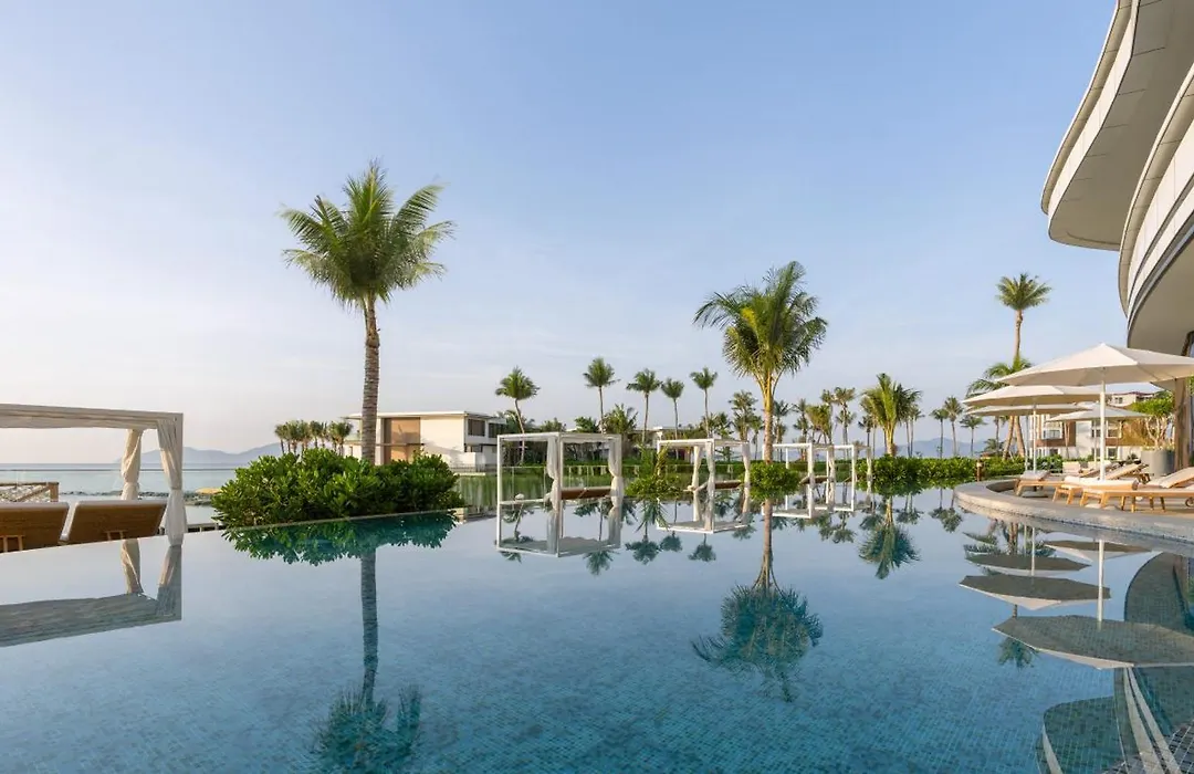 Leisure amenities include a full-service spa with private treatment rooms and onsen lagoons, alongside a private beach area. Guests can embark on a private catamaran charter to explore the coastline or relax in the infinity pool overlooking Nha Trang Bay.