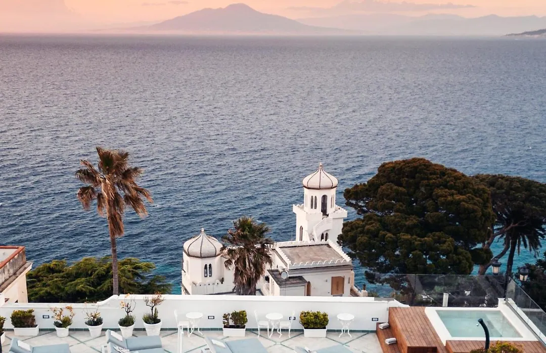 Luxury Villa Excelsior Parco, a 5-star Capri hotel with a 9.7/10 rating on Booking.com, offers panoramic views of the Gulf of Naples and luxurious amenities including a private beach area and electric car shuttle service. Guests can enjoy elegant rooms and refined dining experiences tailored to sustainability and local flavors.