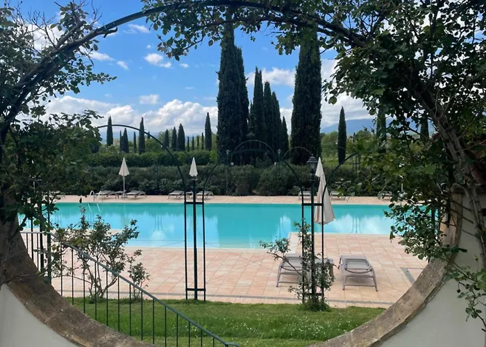 Villa Santa Barbara is a 4-star hotel featuring a large deck-level overflow swimming pool and beautifully landscaped grounds. The property offers a unique blend of historic charm and modern amenities in the Umbrian Valley, providing an ideal base for exploring local attractions.