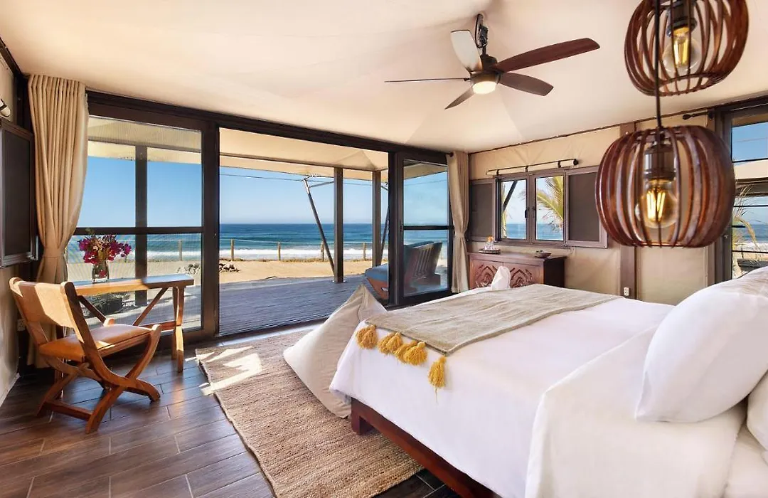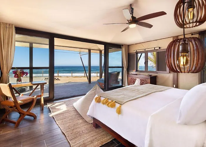 Room options at Villa Santa Cruz include Beach View Bungalows and Tented Ocean Suites, all featuring ocean views and private balconies. Each room offers amenities such as air conditioning and a mini-bar, ensuring a comfortable stay.
