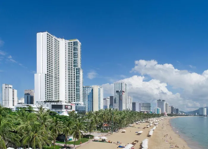 Vinpearl Beachfront Nha Trang, a 5-star hotel with an 8.6/10 rating, offers direct access to a private beach area along with amenities including an outdoor swimming pool and a fitness center. Guests can enjoy complimentary WiFi and a variety of dining options within this luxury accommodation.