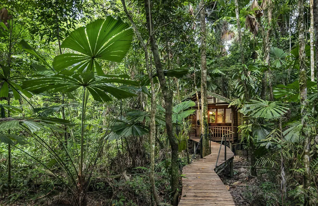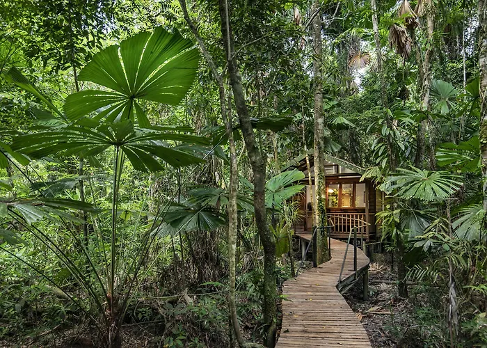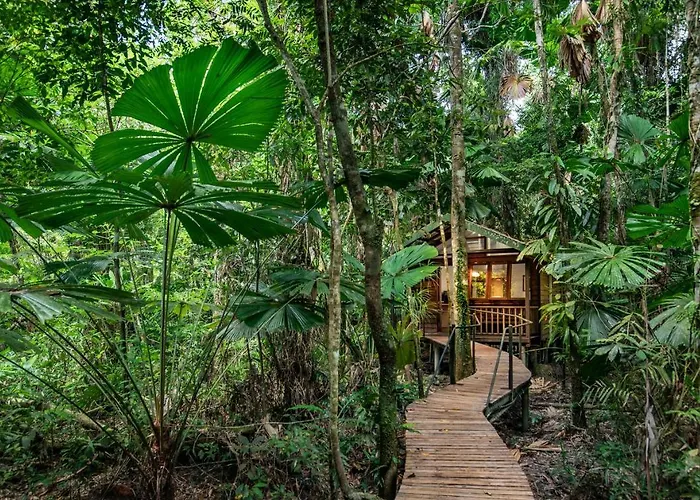 Daintree Wilderness Lodge, a 4-star eco-lodge rated 8.7/10 on Booking.com, features seven eco-certified cabins hidden within the ancient Daintree Rainforest. Guests can expect a sustainable stay with luxurious accommodations, a restaurant serving locally sourced cuisine, and an immersive experience in one of the world's oldest ecosystems.