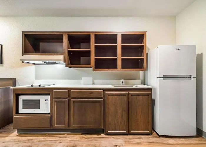 Rooms at WoodSpring Suites feature kitchens fitted with stovetops, refrigerators, and microwaves, allowing guests to prepare their own meals. Accommodations include spacious double rooms with air conditioning and private bathrooms.