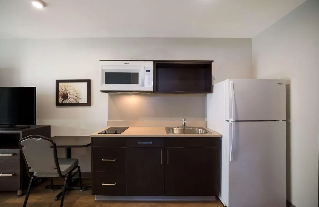 Each suite at Woodspring Suites includes a full kitchen with a refrigerator, stovetop, microwave, and prep space. The accommodations also offer air conditioning, flat-screen TVs, and laptop-friendly workspaces, with bi-weekly housekeeping for long-stay guests.