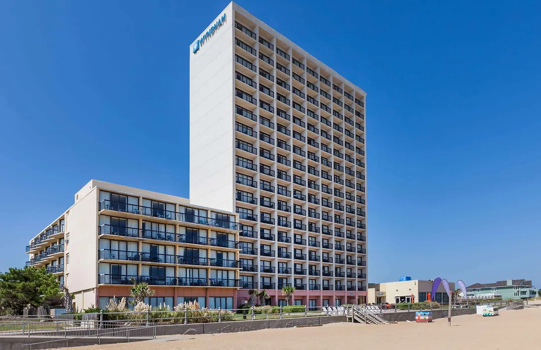 Wyndham Virginia Beach Oceanfront is a 3-star hotel featuring rooms with private balconies overlooking a semi-private beach. Amenities include indoor and outdoor pools, a fitness center, and Surf Club Ocean Grille for dining. The hotel is rated 7.3/10 on Booking.com.